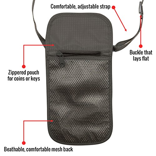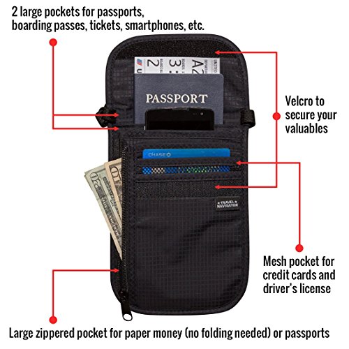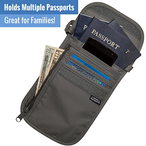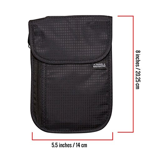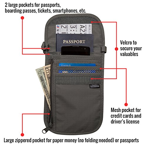 -. Brand : Travel Navigator -. Department : unisex-adult -. Feature : PROTECT YOUR VALUABLES AND PREVENT IDENTITY THEFT: The RFID-blocking material will prevent thieves and scammers from scanning your personal items like passports and credit cards. / PREVENT PICKPOCKETING: The neck wallet allows you to keep your cash, credit cards, passports, & other important items right on your body, making it almost impossible for pickpockets to go unnoticed. / LIGHTWEIGHT & COMFORTABLE TO WEAR: The light material makes it easy to carry, and the well-designed strap and breathable mesh back will be comfortable on top of clothes or against your skin. / STAY ORGANIZED: 6 pockets w/ room for all your important items. HOLD MULTIPLE PASPORTS. Two zippered pockets: one for holding money w/o folding it, the other is perfect for coins and keys. / ONE-YEAR WARRANTY: It's durable and made to last, and if you have any problems in the first year we'll replace it for free! -. ProductGroup : Apparel -. ProductTypeName : LAGE -. Size : One Size -. Title : Travel Navigator Neck Wallet and Passport Holder with RFID Blocking for Security