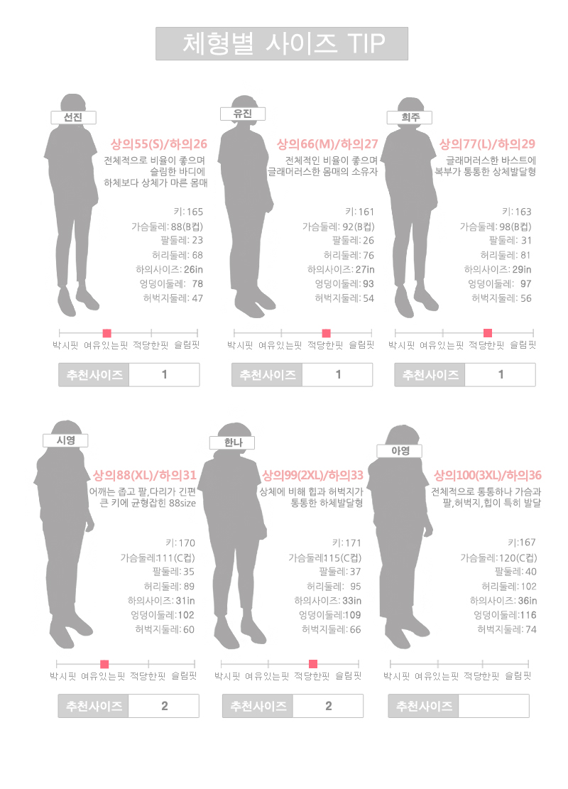 자세한 사이즈는 상세 사이즈 표를 참고해 주세요^^