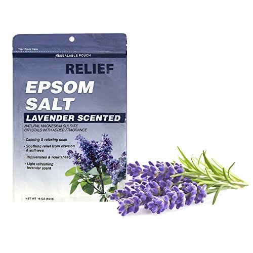 PRODUCT SPECIFICATIONS - Package contains (1) RELIEF Lavender Scented Epsom Salt Magnesium Sulfate Bath Soak, 1 Pound Bag. Used as a soaking aid for minor sprains and bruises, a saline laxative, or for gardening.