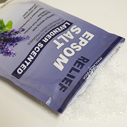 Relief Lavender Scented Epsom Salt. Resealable package. Calming and relaxing soak. Soothing relief from exertion and stiffness. 1 lb package