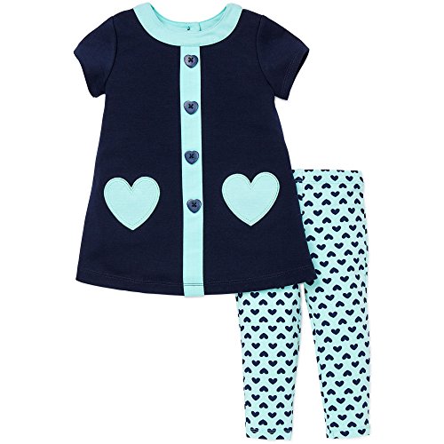 -. Binding : Apparel -. Brand : Little Me -. Color : Navy Blue -. Department : baby-girls -. Feature : Each outfit includes 1 short sleeve tunic A-line dress and 1 pair of heart patterned cotton legging pants / Dress and legging set is a matching outfit. The short sleeve dress shirt is navy blue with aqua blue/green hearts embroidered on the hips / Aqua blue/green pants have an elastic waistband and fitted ankles for a fitted slim look. This style leggings can be paired with Mary jane shoes, ballet flats or boots / Dress buttons in back for easy on and off / Superior details and soft fabrics makes this outfit a fantastic value. You can dress it up for a special occasion or wear it for every day for a cute casual look -. ProductGroup : Apparel -. ProductTypeName : SLEEPWEAR -. Title : Little Me Toddler Girls Green and Navy Heart Short Sleeve Dress and Legging Set