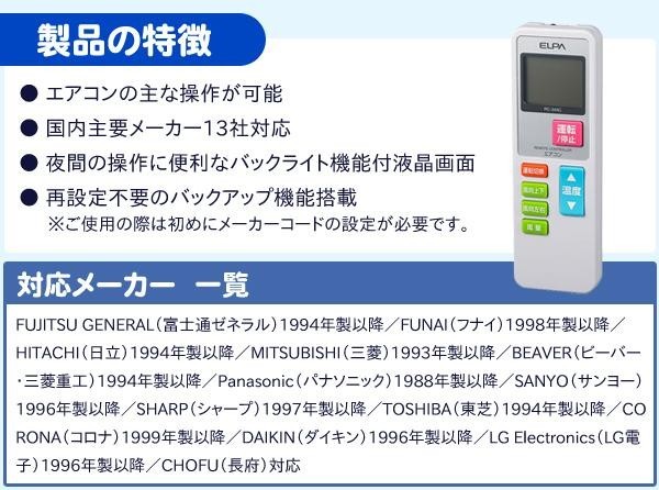 | 仕様 | 動作距離:約7m ※使用機器や部屋の条件により異なる 電源:DC3V(単四形乾電池×2本・別売) 電池持続時間:約12ヶ月(アルカリ乾電池使用時) ※使用頻度により異なる 【対応メーカー】 FUJITSU GENERAL(富士通ゼネラル)1994年製以降、FUNAI(フナイ)1998年製以降、HITACHI(日立)1994年製以降、MITSUBISHI(三菱)1993年製以降、BEAVER(ビーバー・三菱重工)1994年製以降、Panasonic(パナソニック)1988年製以降、SANYO(サンヨー)1996年製以降、SHARP(シャープ)1997年製以降、TOSHIBA(東芝)1994年製以降、CORONA(コロナ)1999年製以降、DAIKIN(ダイキン)1996年製以降、LG Electronics(LG電子)1996年製以降、CHOFU(長府) |
