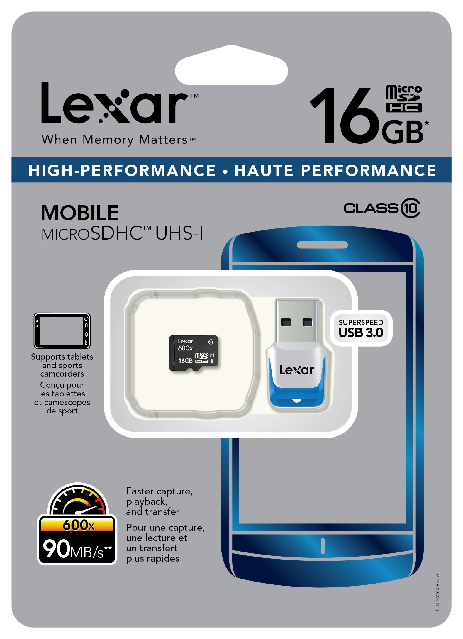 The Class 10 microSDHC UHS-I card and USB 3.0 reader gives you the power to quickly and easily capture, play back, and transfer large, high-quality media files with read speeds up to 90 MB / s (600 x). * The Lexar High