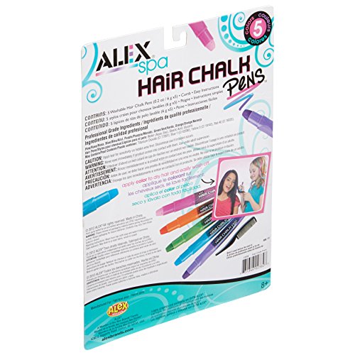 ALEX Spa Hair Chalk Pens let your little diva transform her hair from plain to punk in minutes with vibrant chalk pens! Simply apply to dry hair of any color. When you're ready for another change, simply wash out with shampoo. The set includes Hair chalk pens in pink, orange, green, blue and purple, a comb and easy instructions. Recommended for children 8 years of age and older.Feature