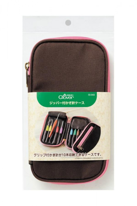 グリップ付かぎ針が10本収納できるケースです。かぎ針編みに必要なメジャー、小さいはさみ、段数マーカー、とじ針などが入るサイドポケット付。かぎ針を入れるスペースもジッパー付なのでゆとりがあり、コピーした編み図(A4の4つ折り)なども入れる事ができます。 |