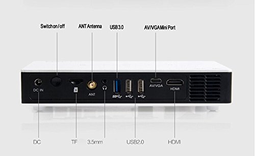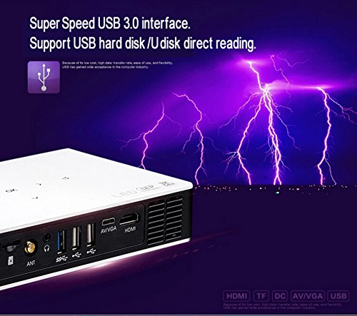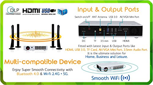 -. Feature : Brightness : 800 Ansi Lumens (equivalent to 3800 Lumens) for richer color and clear viewing even in bright settings / Screen Size : 200" with crystal sharp HD image / Wi-Fi 2.4G+5G, Bluetooth 4.0, DLP 3D Link Technology / Light-weight : Only 1.1 lb and super portable to carry along / Input ports-USB 3.0, 2.0, TF , AV/VGA MiniPort, HDMI / HDMI Cable , AV Cable, VGA Cable and Portable Case Included