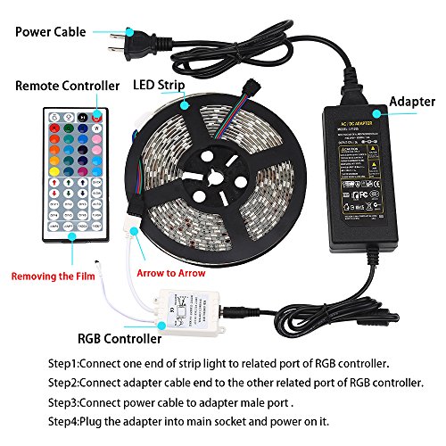 - This is a standard kit . The adaptor is UL listed.They can only load 16.4ft. Please don't increase the strip light. Come with RGB LED strips, remote controller, UL listed AC adaptor and connectors. No more accessories are required. Don't leave them on the spool when you going to test it for more than 2 mins, it easy to lead to overheating.The ventilation must be ensured.These lights need an excessive amount of airflow for cooling.
