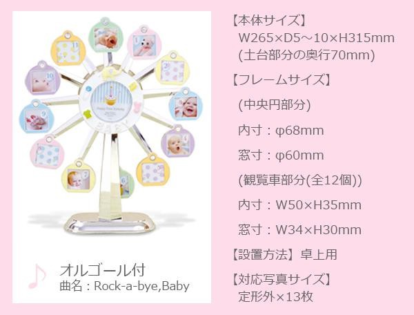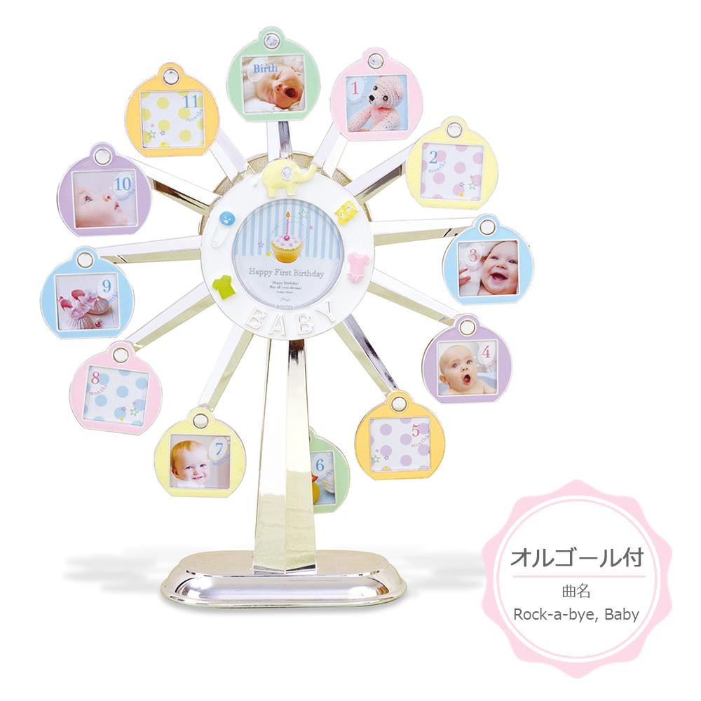 アーム部分がぜんまいになっており、回してから手を放すとメロディを奏でながら観覧車が回転します。産まれてからの毎月の写真と、初めてのお誕生日の写真を納めることができます。 |