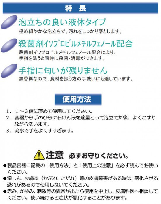 手洗いと同時に、殺菌・消毒ができる石けん液です。原液~3倍まで薄めて使えます。 |