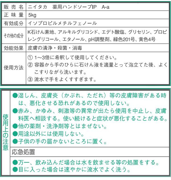 | 成分 | 【有効成分】 イソプロピルメチルフェノール 【その他の成分】 K石けん素地、アルキルグリコシド、エデト酸塩、グリセリン、プロピレングリコール、エタノール、pH調整剤、緑色201号、黄色4号 |