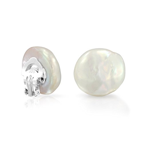 Add sophistication to your attire without calling too much attention with these subtle coin pearl earrings. With a sterling silver clip on backing these 14mm studs are for brides, June babies, and fashionistas.