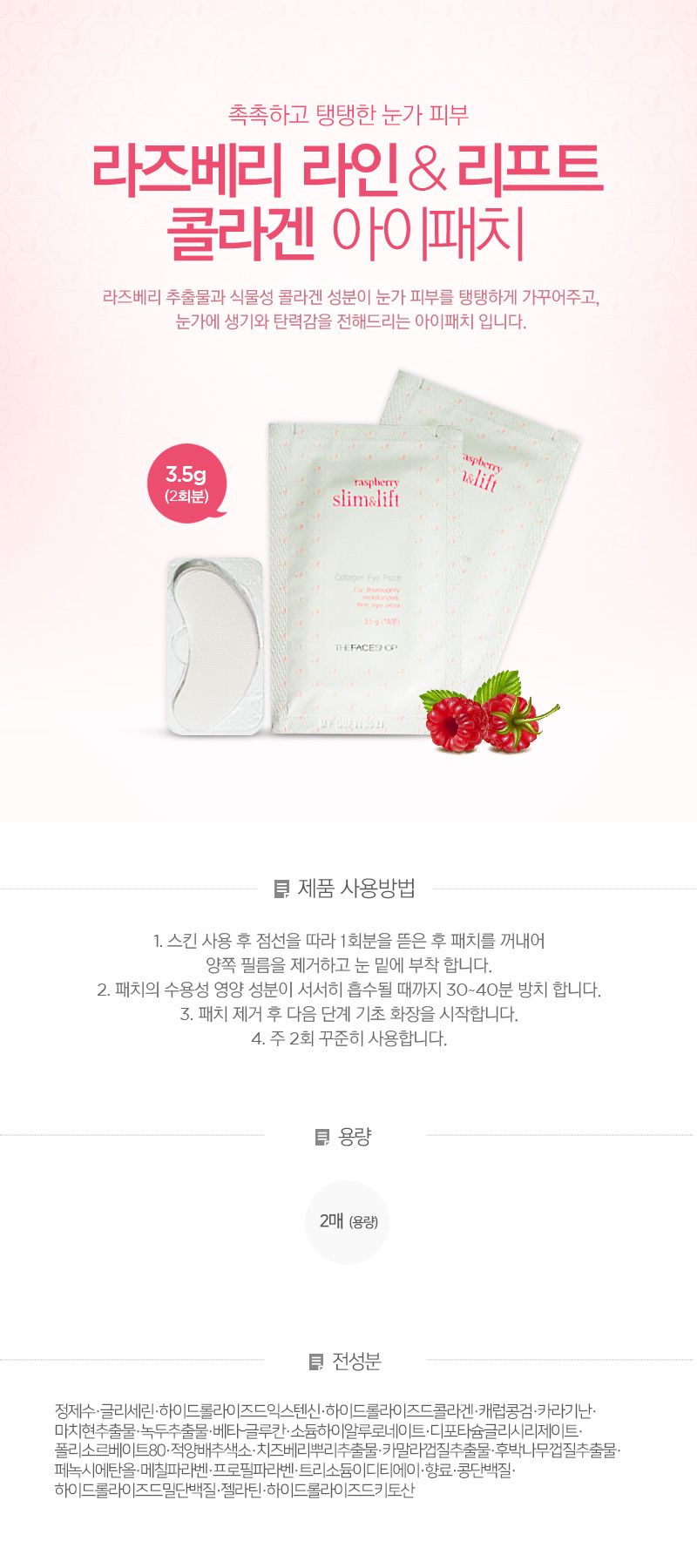 [성분] 정제수·글리세린·하이드롤라이즈드익스텐신·하이드롤라이즈드콜라겐·캐럽콩검·카라기난·마치현추출물·녹두추출물·베타-글루칸·소듐하이알루로네이트·디포타슘글리시리제이트·폴리소르베이트80·적양배추색소·치즈베리뿌리추출물·카말라껍질추출물·후박나무껍질추출물·페녹시에탄올·메칠파라벤·프로필파라벤·트리소듐이디티에이·향료·콩단백질·하이드롤라이즈드밀단백질·젤라틴·하이드롤라이즈드키토산