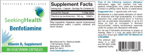 -. Feature : Provides 150 mg of benfotiamine, a well-absorbed, fat-soluble form of thiamine (vitamin B1). / IMPORTANT: Benfotiamine is sold exclusively by Seeking Health on Amazon.com. We DO NOT recommend purchasing this product from any supplier other than Seeking Health on Amazon. / Free of Inulin or FOS, Streptococcus, Casein, Corn, Dairy, Egg, Fish, Gluten, Magnesium Stearate , Peanuts, Shellfish, Soy, Titanium Dioxide, Tree Nuts, Wheat. / May help support cellular and cognitive health. / Physician-formulated.