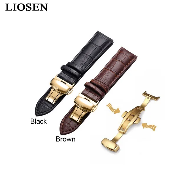 | [해외]Liosen 18-24 미리메터 더블 버튼 배 butterfly 버클 정품 가죽 손목 시계 검은 갈색 시계 줄 황금 버클 시계 스트랩 |