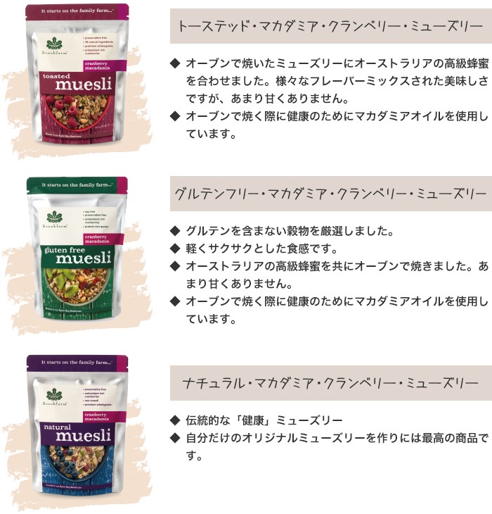 オーストラリアのバイロンベイマカダミア農場【ブルックファーム】が、オーストラリア産の食材だけの使用にこだわり作った、食物繊維たっぷりの厳選された穀物と大粒のオーストラリア産ドライフルーツやマカデミアナッツ等を加えたヘルシーで腹持ちのよいミューズリーです。グラノーラと違い、ミューズリーは製造過程で熱を加えないため、腸内環境を整えるのに重要な『酵素』を破壊することがありません。またミューズリーは砂糖を使用せず、オーツ麦など生の穀物をつぶしたものに、ドライフルーツを加えただけなので、穀物由来のビタミン、ミネラル、繊維質も豊富です。腹持ちもよくお腹もスッキリなので、朝食や軽食にピッタリです。【ブルックファームの健康へのこだわり】■16種類もの様々な食材をバランスよく配合■オーストラリアの最高品質の栄養素の高い穀物類やドライフルーツと ブルックファーム自慢の最高のマカダミアナッツをミックス■保存料、添加物不使用■たくさんの繊維質を含み、コレステロールゼロ※コーシャー・ハラル認証済み食品です。こちらは使い切りサイズの1袋1食分なので、置き換え食としても携帯食としても便利です。