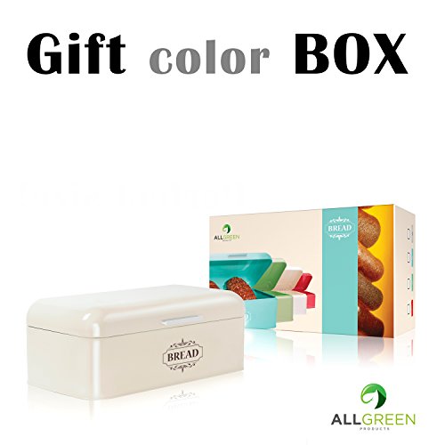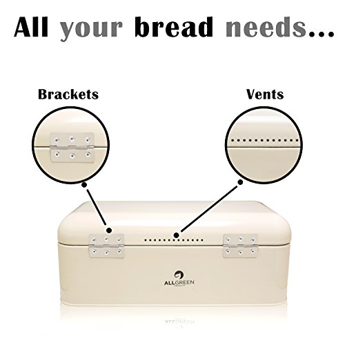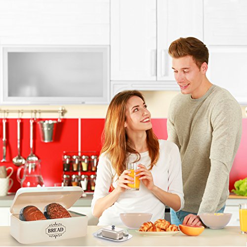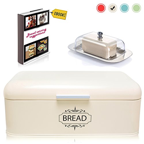 Vintage Bread Box For Kitchen Stainless Steel Metal in Retro Cream Off White + FREE Butter Dish + FREE Bread Serving Suggestions eBook 16.5" x 9" x 6.5" Large Bread Bin storage by All-Green Products