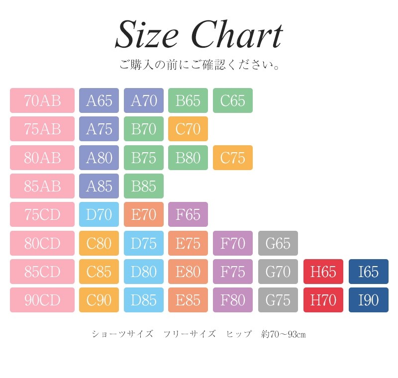 | サイズ | ( 70AB ) アンダー : 68~72cm、トップ : 80~84cm ( 75AB ) アンダー : 73~77cm、トップ : 85~89cm ( 80AB ) アンダー : 78~82cm、トップ : 90~94cm ( 85AB ) アンダー : 83~87cm、トップ : 95~99cm ( 75CD ) アンダー : 73~77cm、トップ : 89~93cm ( 80CD ) アンダー : 78~82cm、トップ : 94~98cm ( 85CD ) アンダー : 83~87cm、トップ : 99~98cm (上薄下厚パッド内臓)70AB、75AB、80AB、85AB (パッドなし)75CD、80CD、85CD ショーツ ( F ) ヒップ : 約70~93cm、着丈 : 約22cm |