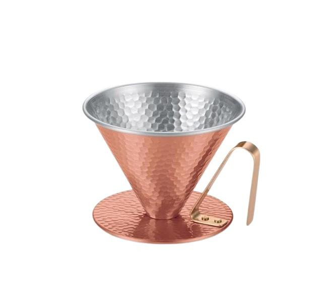お湯がさめにくく、何度も注ぎ分けるハンドドリップに最適。 製造国:日本 素材・材質:本体:銅ハンドル:真鍮 商品サイズ:約130×115×90mm 重量:174g 仕様:3~4人用食洗機:不可内面:錫メッキ外面:クリア塗装 ※サプライヤー直送品 ご注文後5~6営業日後の出荷となります【商品名】銅のコーヒードリッパー(大) 槌目 4222