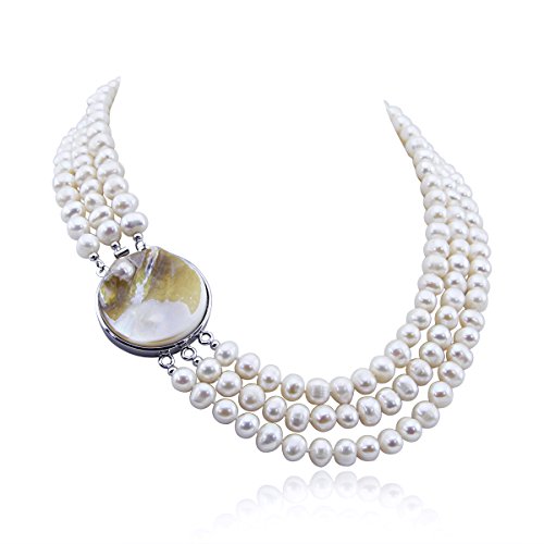 Pearlpro 3-Row White A Grade Freshwater Cultured Pearl Necklace with Mother of Pearl Clasp (6.5-7.5mm), 17", 18", 18.5"