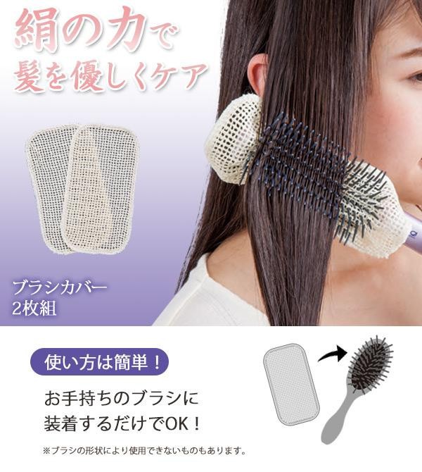 | [カバーの取り付け方] カバーを左右に引っ張りながらブラシの目に沿ってカバーを奥まで差込みます。 [使用方法] シャンプー後など水分を含んだ毛髪に優しくブラッシングしてください。抜け毛等が溜まったらカバーを外し、ゴミを取り除きます。カバーの汚れが気になる場合は、軽く手洗いしてください。 [使用上の注意] ●本来の用途以外のご使用はおやめください。●髪や頭皮に異常がある場合はご使用にならないでください。●ブラシの形状により使用できないものがあります。●ドライヤー機能付きブラシなどには使用しないでください。●洗濯は中性洗剤を使用し、軽く手洗いをしてください。●繊維と製法の特性上、洗濯後伸縮しますので、軽く水を切り、引っ張り伸ばして形を整え陰干しにしてください。●塩素系漂白剤は絹の繊維を傷つけますので、ご使用にならないでください。 |