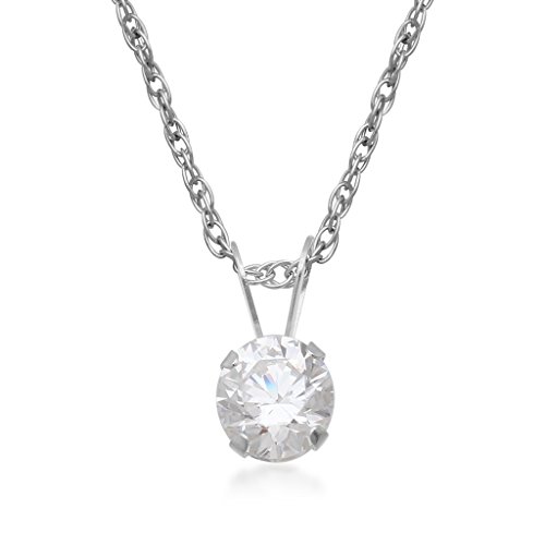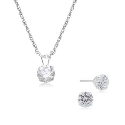 10kt White gold set of solitaire pendant necklace and stud earrings set embellished with Swarovski Zirconia. The pendant includes an 18" rope chain. The earrings are secured with butterfly ear nut and post.