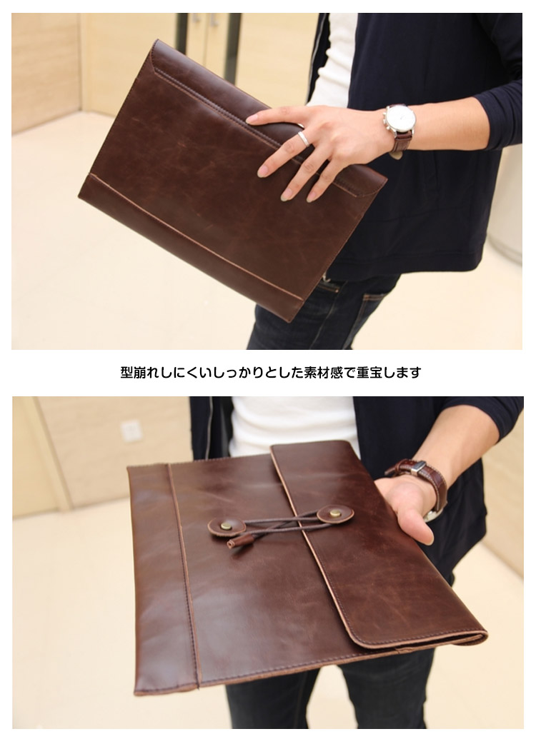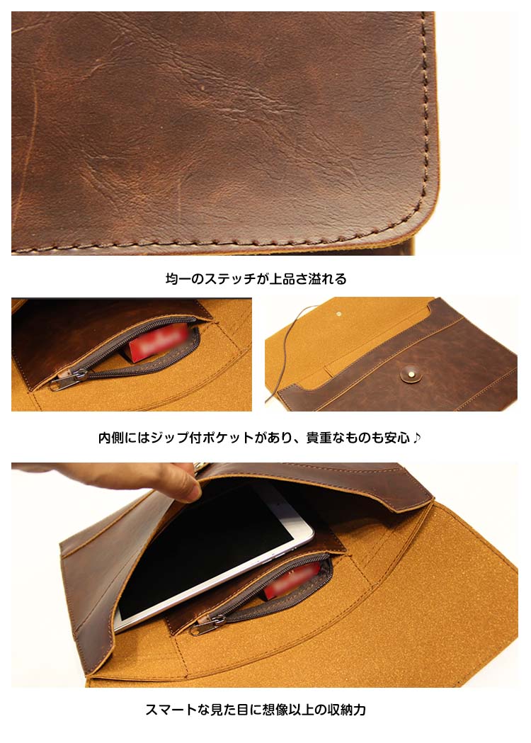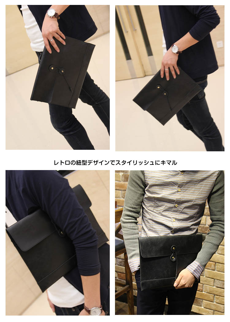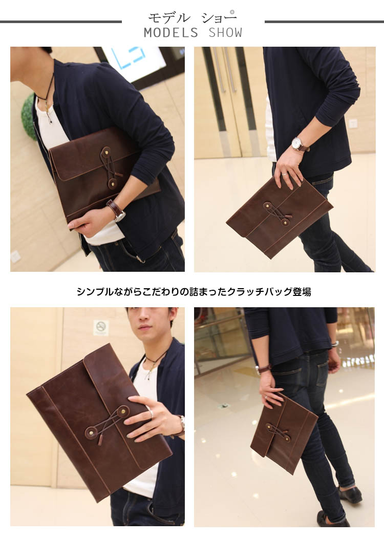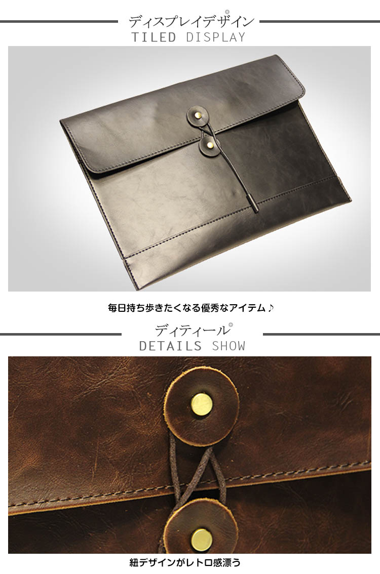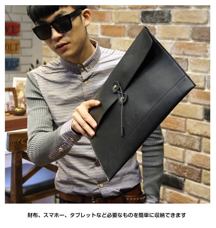 | シンプルながらこだわりの詰まったクラッチバッグ登場型崩れしにくいしっかりとした素材感で重宝しますレトロの紐型デザインでスタイリッシュにキマル財布、スマホー、タブレットなど必要なものを簡単に収納できます毎日持ち歩きたくなる優秀なアイテム♪ | |