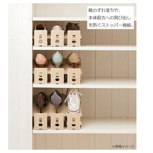 ハイヒール・ローファー・スニーカー等、靴の高さに合わせて3段階に調節可能なくつホルダー。様々な靴を半分のスペースに収納できるので、2倍の収納量を実現します。 |