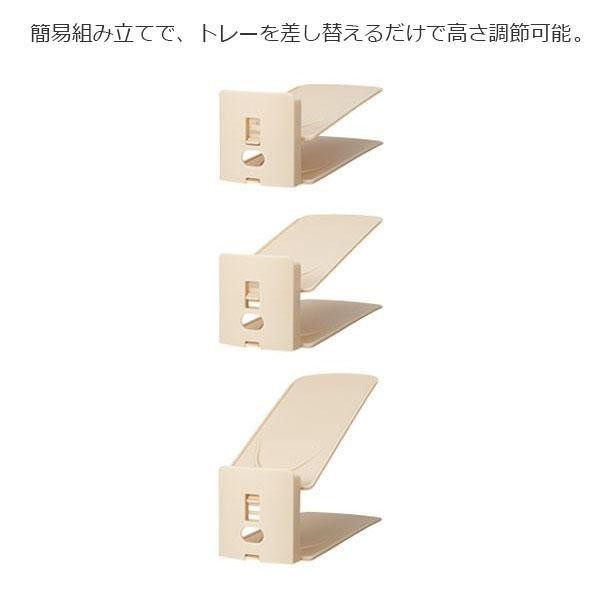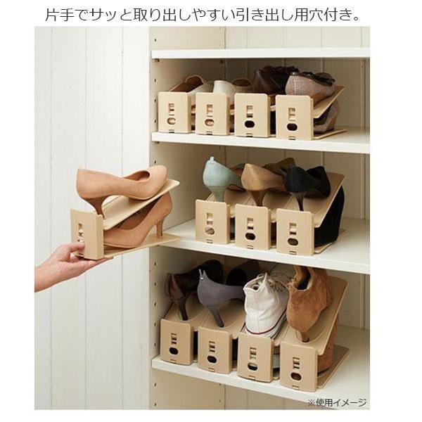 | ハイヒール・ローファー・スニーカー等、靴の高さに合わせて3段階に調節可能なくつホルダー。様々な靴を半分のスペースに収納できるので、2倍の収納量を実現します。 |