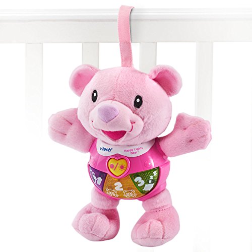 -. Binding : Toy -. Brand : VTech -. EAN : 0050803733506 -. Feature : Teddy bear toy engages your little one during playtime; made of soft and safe fabric that is great for babies / Electronic soothing toy provides auditory stimulation with 35+ sing-along songs, melodies, sound effects and fun phrases / Crib toy has chunky light up buttons that flash along with the music; soft cuddle bear introduces 123's and early emotions / Makes a great diaper bag toy, or attach the talking teddy bear to the crib or stroller with the included Velcro strap / Talking stuffed animal education toy is intended for babies 3 to 24 months old; 2 AAA batteries included for demo purposes -. Label : VTech -. Manufacturer : VTech -. Model : 80-073350 -. MPN : 80-073350 -. PackageQuantity : 1 -. PartNumber : 80-073350 -. ProductGroup : Toy -. ProductTypeName : FASHIONOTHER -. Publisher : VTech -. Studio : VTech -. Title : VTech Happy Lights Bear - Pink -. UPC : 050803733506