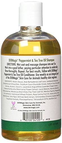 Free from harsh chemicals, this shampoo prepares inflamed skin for treatment with DERMagic Hot Spot Lotion or Salve and is perfect for bathing dogs any time. Combining calming distillates of peppermint, melaleuca (tea tree oil), lavender, chamomile, and rosehip seed oils with the conditioning properties of aloe vera, vegetable glycerin, oat extract, and wheat proteins, DERMagics shampoo is specially formulated to soothe and condition the skin, eliminate odor and stimulate the healing process. A foaming, sulfate-free shampoo with a delightfully fresh scent, this is the first step in restoring healthy skin and shiny fur in animals. Use together with our all-natural Peppermint and Tea Tree Oil Conditioner for best results. (Not recommended for cats.) To use, just wet your dog and lather up, and rinse immediately. Do not leave your dog standing with suds on him. And please don't bathe your dog too often! For healthy dogs, we recommend bathing twice a month, or whenever they get dirty, whichever is longest between baths. Keep their coat fresh between baths by brushing and combing daily.Feature