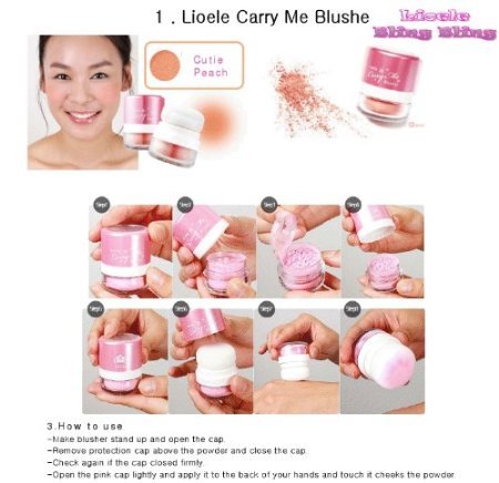 -. Feature : Lioele Carry Me Blusher - Cutie Peach / Gives your cheek a natural Cutie Peach, sunkiss tone, and without lumping with micro crystal powder and makes skin clear and transparent / New design, contains a small mirror on the top.