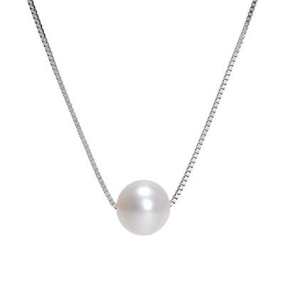 The premium white, round solitaire pearl is of AAA grade quality, 7.5-8 mm in size and drapes delicately around the neck on a fine 16" sterling silver Venetian chain with a snap ring clasp. Its authenticity and quality is guaranteed.