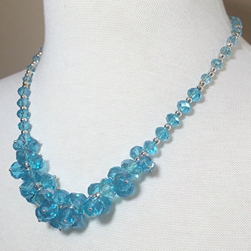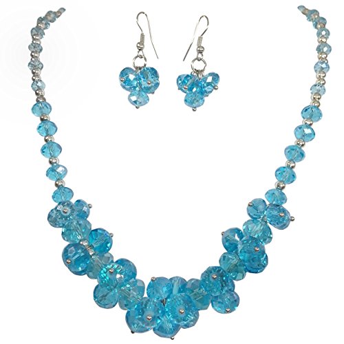 Glass Cluster Beads Silver Tone Statement Necklace & Dangle Earrings Set (Aqua Blue)