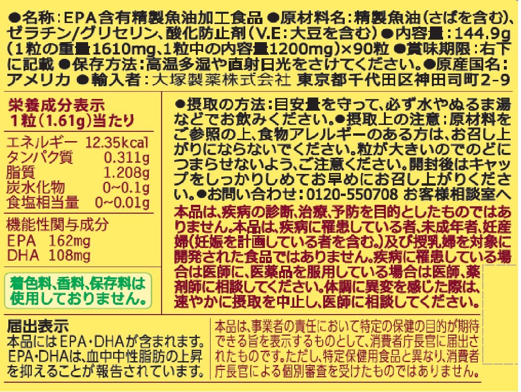 栄養成分 :栄養成分表示1粒(1.61g)当たり エネルギー12.35kcaL、タンパク質0.311g、 脂質1.208g、 炭水化物0-0.1g 食塩相当量0-0.01g※機能性関与成分 EPA:162mg、DHA:108mg