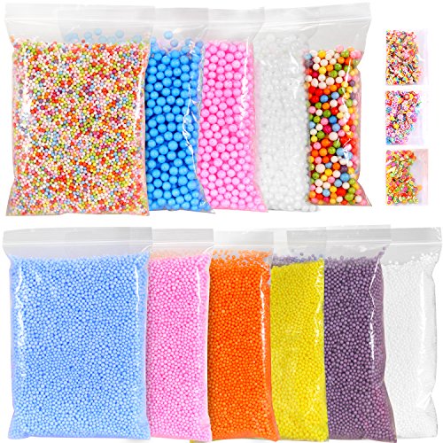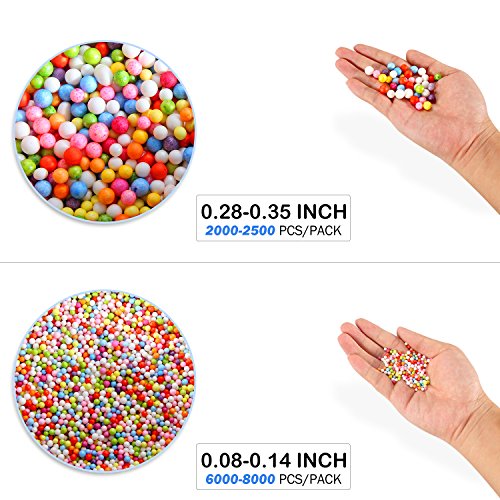 - ❤ WIDE ASSORTMENT: 14 packs of polyestrene Styrofoam beads. Total of 60,000 pcs – 7 packs of 0.08-0.14in colored balls (6000-8000pcs/pack), 4 packs of 0.28-0.35 in colored balls (2000 - 2500pcs/pack), and 3 packs of printed slime spices (300pcs/pack).