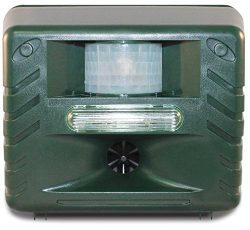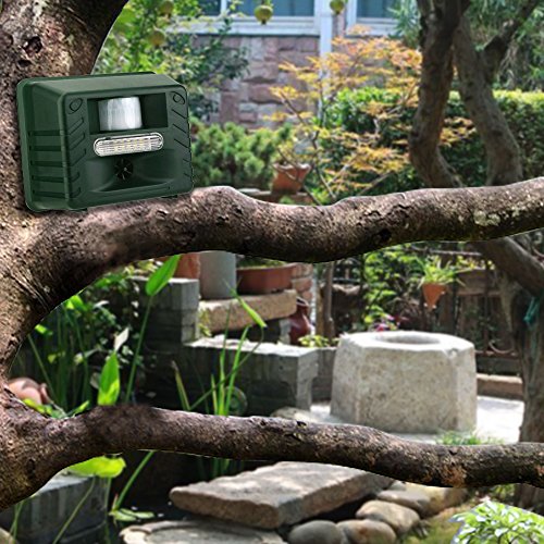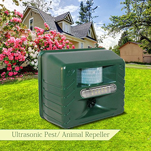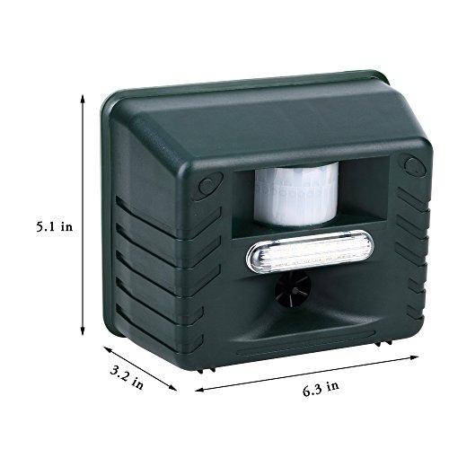 -. Feature : As a bird control device: uses ultrasonic sound waves (silent to most humans, high-pitched and irritating to birds) to force away unwanted pest birds & small animals. The emitted sounds annoy pest birds & drives them away to areas that are more calm & unthreatened. / As a pest repeller: Durable and Weatherproof, can be used in Home, Office, Hotel, Patio, Attic, Warehouse, Basement, Garage, Yacht, etc TO REPEL Mice, Squirrels, Deer, Chipmunks, Fox, Bat, Raccoon, Wolf, Skunk, Coyotes. etc / Multifunctional: Ultrasinic Sweep + Infrared Motion Sensor + Intruder Alarm + Adjustable Working Hours / Deter pigeons, crows, blackbirds, sparrows, starlings, swallows, grackles, ducks, seagulls and gulls, rodents, bats, & more. Where to Use This ultrasonic device is perfect for small, covered outdoor areas up to 2000 sq. ft. Ideal for balconies, porches, carports, patios, yards, garages, small pool areas, greenhouses, enclosed gardens, & more. / Parameters: Color: Dark Green, Weight: 950g Apx. Power: 110V 3.6Watt (Powered by D/C Source or AA Batteries). Product size: 17 X 14 X 9cm, Package size: 25 X 19 X 10cm, comes with mounting holes and screws, and intruction manual.Adapter is included.