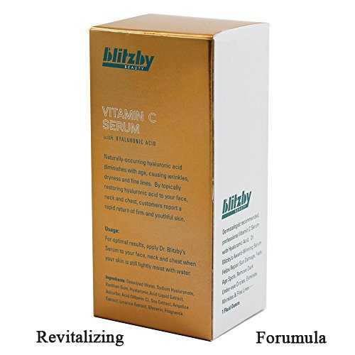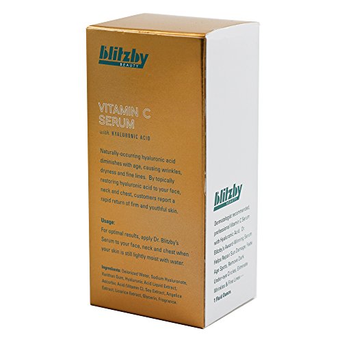 Studio : Blitzby Publisher : Blitzby Binding : Health and Beauty Product Description Dermatologist recommended Vitamin C serum with hyaluronic acid dr. Blitzby's proprietary anti-aging formulation has been proven to reduce the appearance of wrinkles and fine lines, while helping to boost sub-dermal collagen production-a key process in restoring youthful, healthy skin. Improved skin firming properties help brighten and tone your face for a smoother, fresher, more revitalized youthful complexion. Highest quality ingredients - formulated by dermatologic scientists for optimized penetration. Vitamin C or ascorbic acid is a water-soluble nutrient that, in addition to its antioxidant properties and well-known role in boosting the immune system, Vitamin C is a proven wonder at synthesizing collagen - the one thing your skin needs the most to look youthful and bright. According to research, Vitamin C has been shown to help protect and repair skin cells. Not only does this wonder nutrient wipe away free radicals, but it can also remove the dna damage caused by free radicals in your skin. Customers have replaced their anti-aging creams with this serum and agreed this hyaluronic acid serum works best. The journal of the American academy of dermatology published research that concluded, "appreciable photo-protection can be obtained from the combination of topical Vitamin C and e, while a second study determined that spreading a Vitamin C serum over your skin might correct aging-associated structural changes that occur over the years." Naturally found in the human body, hyaluronic acid secures moisture and creates fullness that rejuvenates youthful, healthy skin. Naturally-occurring hyaluronic acid diminishes with age, causing wrinkles, dryness and fine lines. By topically restoring your face, neck and chest with hyaluronic acid serum, customers report a rapid return of firm and youthful skin. 0