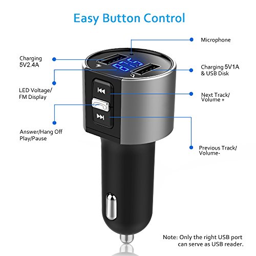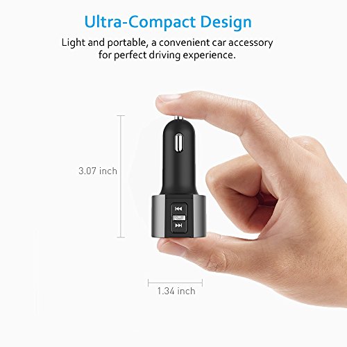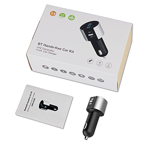 Comsoon Bluetooth FM transmitter, wireless car kit with dual port car chargers the easiest way to add Bluetooth function to your car stereo system; the simplest hands-free solution to bring wireless audio to your existing car stereo and listen to your favorite songs. Safe for calling built with a high-quality microphone, totally free your hands, just press the phone call button and speak while you are driving with both hands safely. How to adjust FM? 1)Simply tune your car radio to any unused empty frequency (87.5 -108Mhz), 2)match this transmitter to the same frequency: long press the phone call button until the digital frequency flashes, shortly press the up/down key to achieve FM frequency increase/decrease. Specifications: material: ABS USB output: 5v/3.4A product input: 12v-24v charger output: 5v/3.4A music format: mp3, WMA FM transmission distance: 5m Bluetooth protocol: avrcp, hfp, a2dp screen display: blue LED digital display usb(max capacity): 32gb (not included).Feature