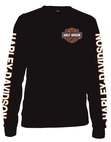 -. Feature : Harley-Davidson Bar & Shield Shirt / Black / 100% Cotton / Orange Bar & Shield on chest and Harley graphics down sleeves / Long Sleeve