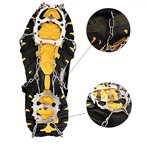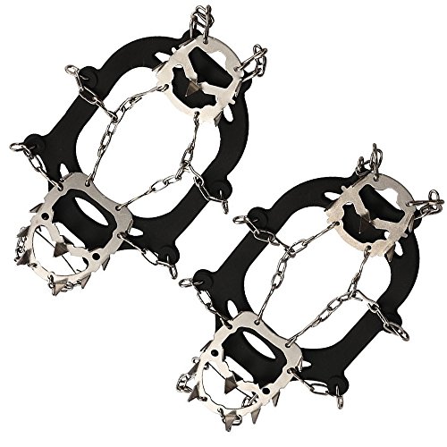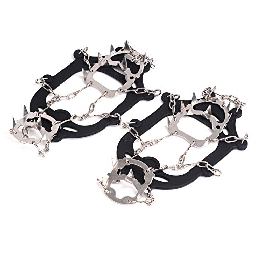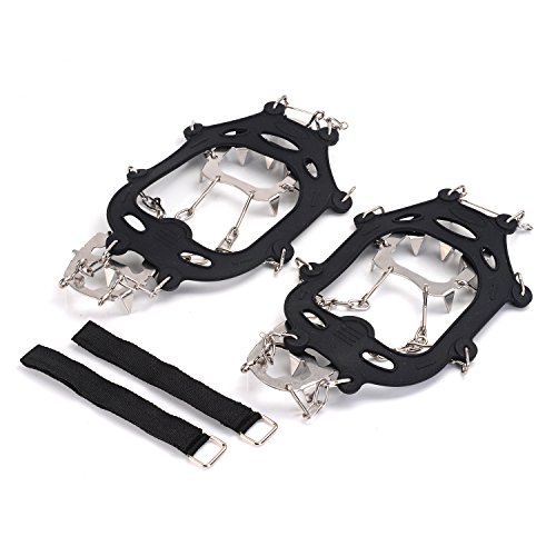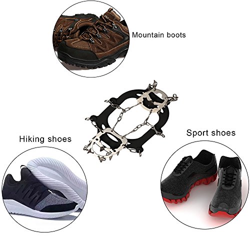 Product Description Ravifun 18 Teeth Chain Stainless Steel Ice Crampons with Straps and Carry Bag Feature: Condition: 100% Brand new and high quality. Material: High density stainless steel, rubber. Teeth: 18 teeth. Length of teeth: 1.8cm/ 0.7inch Weight: 415g/pair. Color: Black Suitable for shoes: with all kinds of sports shoes, mountaineering shoes and mountaineering boots, apply ice and grassland environment. Portable: Designed for reducing the risk of walking on icy or slippery surfaces. 18 sharp teeth give you a sense of security when walking. Easy on/off to fit boots, sneakers, casual shoes. Simple and lightweight crampons, climbing through the crowd for the winter to go ice pavement. Hard plastic tape into a super elastic rubber band, more flexible, suitable for different shoe size, more paste. Ideal for everyday use, outdoor winter work or a variety of winter activities such as ice fishing, hunting, walking, jogging, hiking, running, snow shoveling, etc. Walk with confidence on any terrain, snow, ice, mud sand, and wet grass. Size: M: US Shoe Size Men<7, Women<8. L: For US Shoe Size Men=7-11,Women=8-12. XL: For US Shoe Size Men=11-12.5,Women=12-13.5 How to use?? 1. Toes into the sign of FRONT? 2. Stretched to the heel,can be fixed? 3. The front of wire and toe cap should keep a line? Package List: 1 * Pair of Crampons 1 * Pair of Velcro Straps 1 * Piece of Carry Bag Notes: 1. Traction cleats ONLY, shoes displayed in pictures are NOT included. The pictures are only for showing more details for your information.? 2. The ice cleats is use for outdoor walking slip, suitable for snow, slippery roads, ice, grass, etc.,do not use as technical climbing and other specialized tools.?