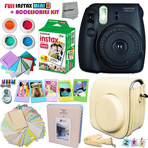 FujiFilm Instax Mini 8 Camera BLACK + Accessories KIT for Fujifilm Instax Mini 8 Camera includes: 20 Instax Film + Custom Fitted Case + Assorted Sticker, Plastic & Paper Frames + Photo Album + MORE