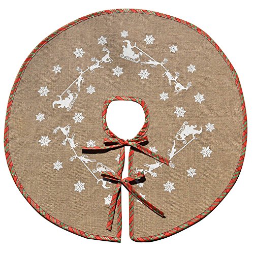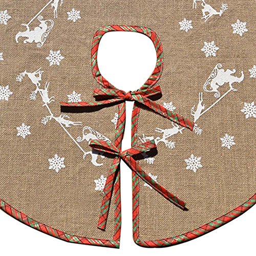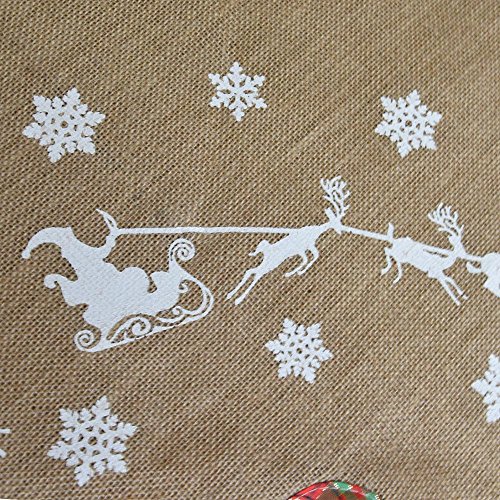 100% high quality Jute burlap with classic white snowflakes, Santa and deer print, perfect for Christmas tree decor, add more joyful atmosphere to the holiday.