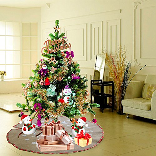 Material:Jute burlap Size:48" in diameter Skirt tree Color:Khaki Burlap Pattern: white snowflake Printed Side Color: red and green plaid With Golden silk Adornment:Gold edge Glitter Feature: 1 .Protect your home from pine needles and tree sap with this beautiful decorative tree skirt. 2.Burlap tree skirt with classic Christmas element and vibrant red and green edge, add your Christmas tree with more vibrant. Package list: 1 x 48" Round Burlap Tree Skirt