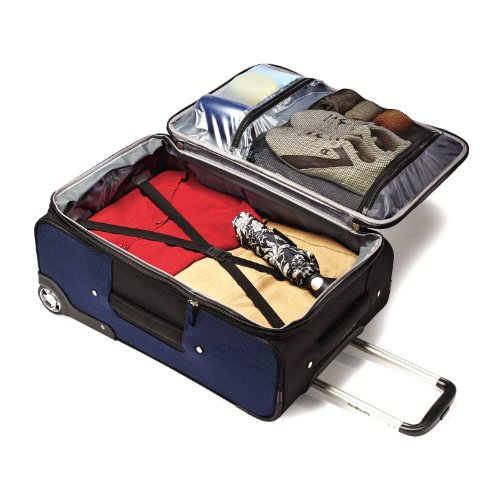 • Color-block upright suitcase featuring co-molded pull handle with slotted handle tubes