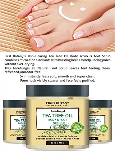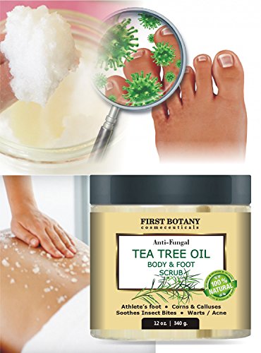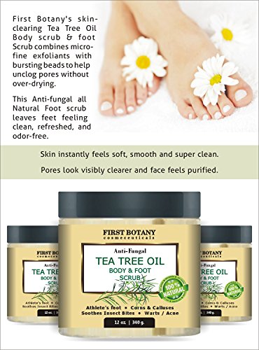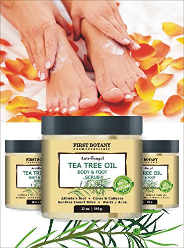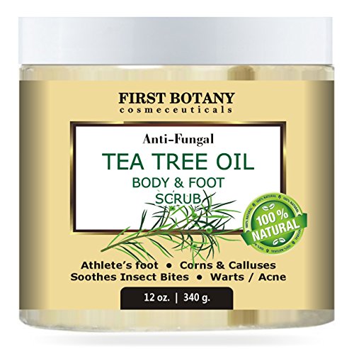 NATURAL EXFOLIATOR SKINCARE: Tea tree oil body scrubber has so many anti-viral and anti-fungal benefits. We present our new antifungal foot and body scrub.. What a natural benefit for Athletes Foot treatment, Psoriasis, Ringworm, Anti Jock Itch treatment, Callus Remover, Nail Fungus & Body Odor!