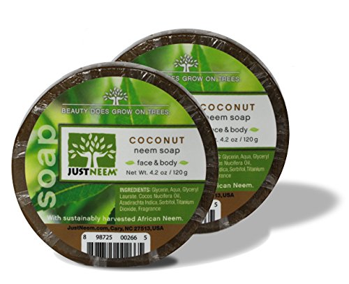Coconut Neem Soap is richly moisturizing due to its Coconut Oil and Glycerin base. In addition, the healing benefits of Neem found in this bar help nourish your skin and keep it healthy. This Coconut Neem Soap is perfect for irritated and stressed skin, as it helps relieve dryness and helps fight skin infections. Many customers have reported excellent results for rosacea, eczema and acne-prone skin, likely because of the high Neem content and the excellent healing environment created by the combination of emollient compounds. All our Neem Soaps are made with West African Neem and the highest grade oils and cosmetic-grade fragrances. About this Fragrance: This sweet Coconut fragrance is simply irresistible! Imagine warm scents of paradise mixed with the soothing high notes of Vanilla... This exotic and relaxing soap brings to mind beach chairs and days of basking in the sun. Why Neem in Soaps? Neem is a famous skin-supporting remedy. Neem's natural antihistamine properties together with its active antibacterial, anti-fungal, and antiviral compounds cleanse, soothe, reduce irritation, restore skin's elasticity and combat topical inflammation and infections. Neem works wonders to restore your skin to its fullest potential. With this soap you're doing more than cleansing. You're lathering on protective ingredients that strengthen your skin and help address imbalances and irritations.Feature
