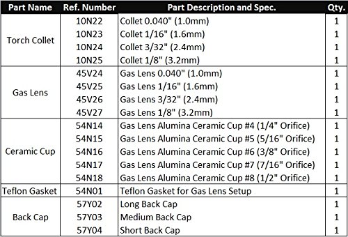 - 4 collets 0.040", 1/16", 3/32" and 1/8" (10N22, 10N23, 10N24 and 10N25). 4 gas lens collet bodies 0.040", 1/16", 3/32" and 1/8" (45V24, 45V25, 45V26 and 45V27).