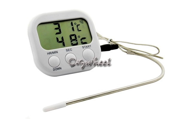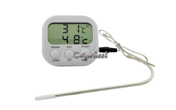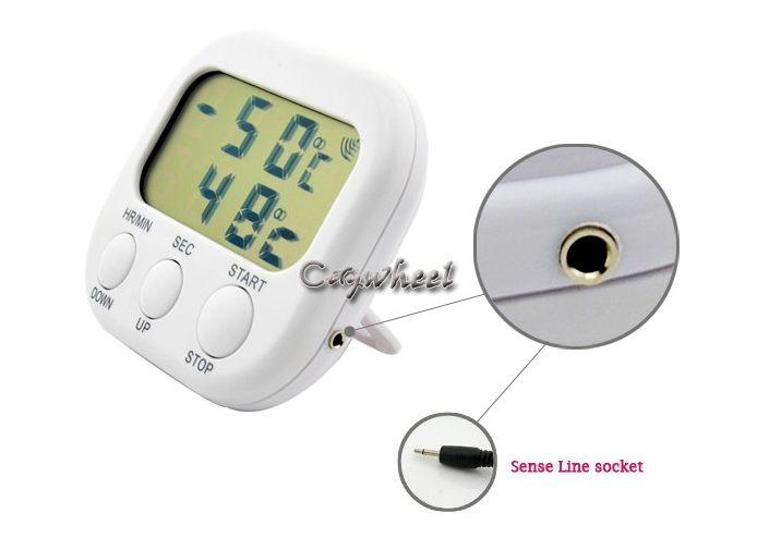 100% Brand NewColor:u0026nbsp;WhiteSize:8cm x 7.5cm x 2cm(L x W x H)Battery:1 x AAAu0026nbsp;(Battery is not included)Sense lineu0026nbsp;lenght:78cmThis device provides you with an easy to use the Thermometer u0026amp; Timer with alarm function in kitchen, factory or BBQ.USING THE THERMOMETERu0026nbsp;1.u0026nbsp;Use one 1.5V, AAA Battery (not included)