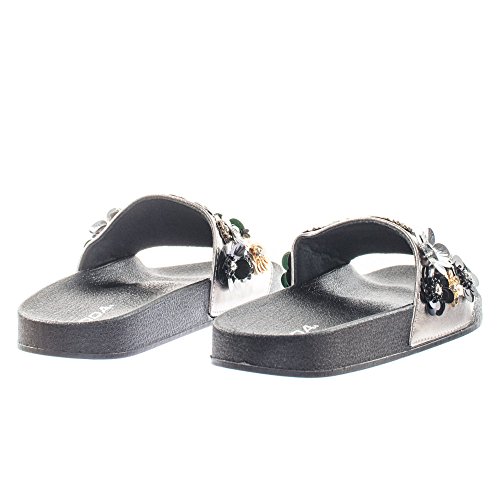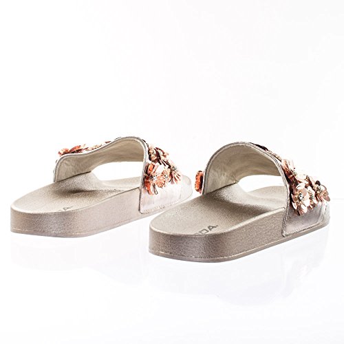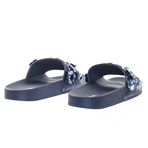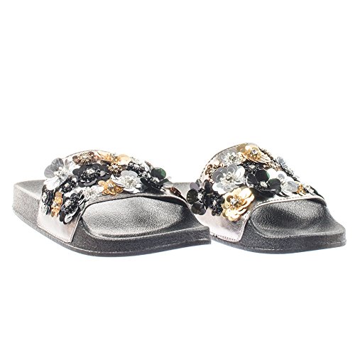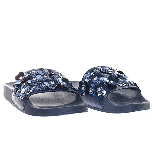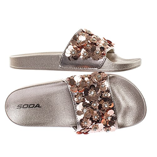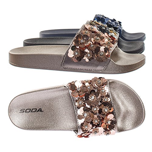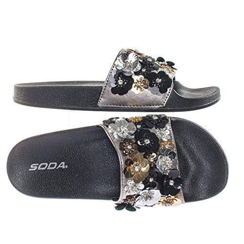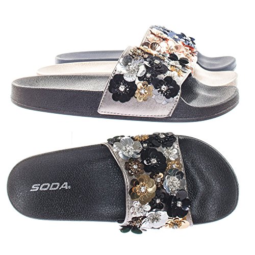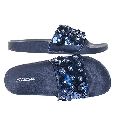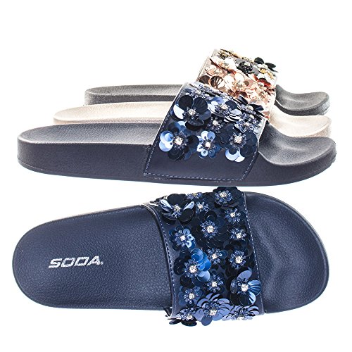 Binding : Apparel Product Description About This Shoes :These easy slip sandals features a molded footbed platform, large single band upper, slide in construction, assorted rhinstone, beads and sequins flower adornment on the vamp. Brand - Soda Colors Available: Navy Blue, Gunmetal, Penny Gold Occasion: Casual Shoe Type: Slides Shoe Style: Slides Inner Lining: synthetic Heel Height In Inches - 0.25 Heel Style - 0 Toe Style - open-toe Platform Height In Inches - 1.00" Shaft Height In Inches - Circumference Opening - Strap Type - 0 Sole - rubber All Man Made Material unless otherwise stated. Computer/Phone/Table monitors might show color differently because of its quality or calibration, we suggest you look at the photo in at least 3 monitors if you need exact color match of your shoes. 0