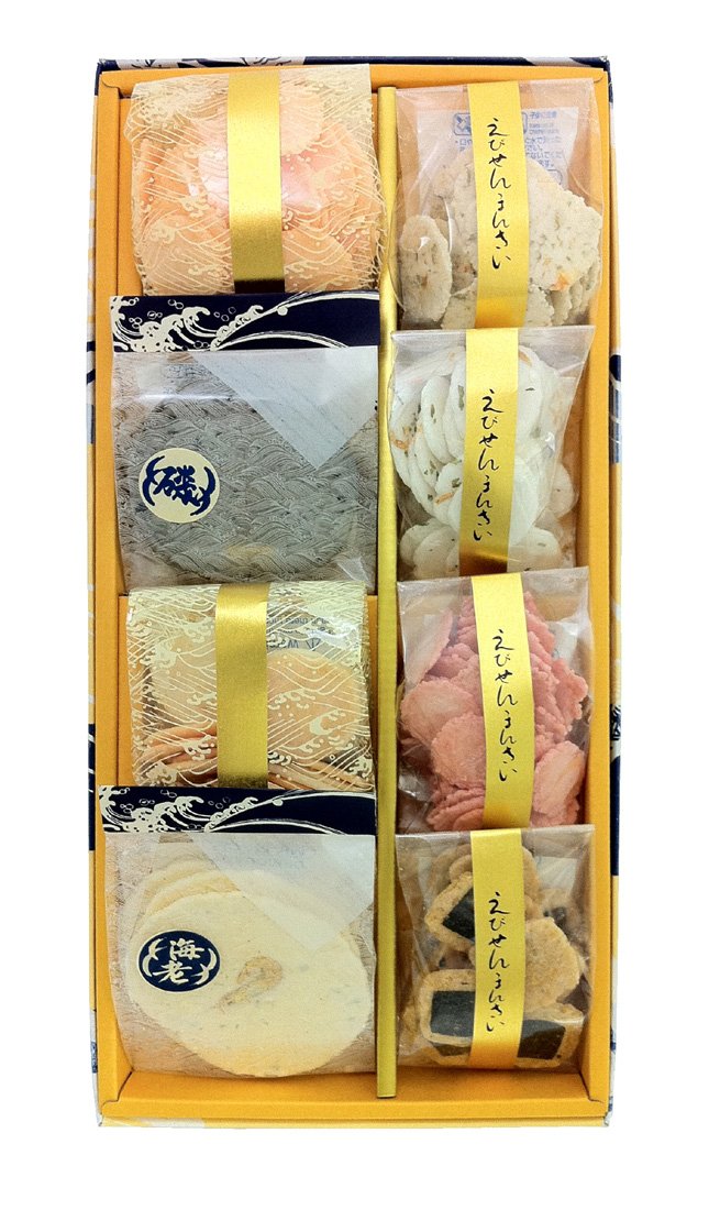 内容量:8個(わかめせん(4枚)1個、小梅(20g)1個、特えび(5枚)1個、のり松風(14g)1個、磯味(26g)1個 、小花丸(17g)1個、ごもくわさび(18g)1個、夕月(15g)1個)